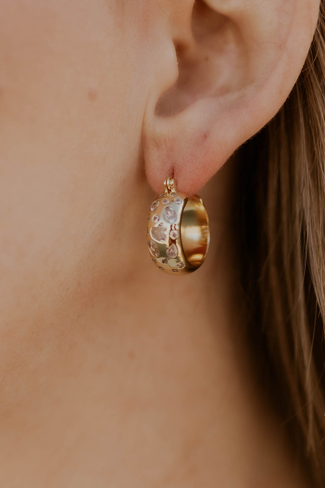 - These gold hoop earrings are encrusted with uniquely shaped translucent Cubic Zirconia stones scattered beautifully to create a refined yet dazzling appeal.