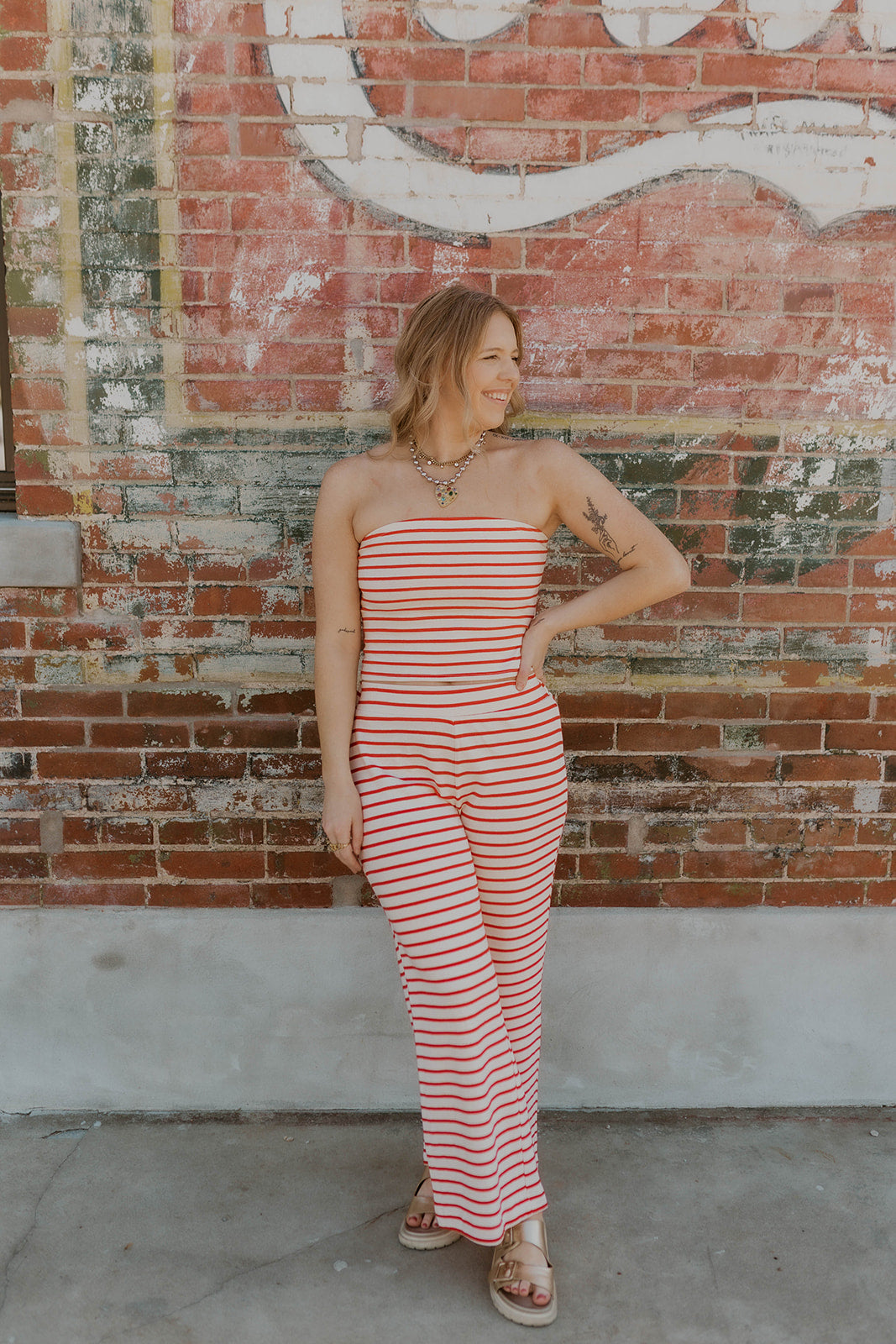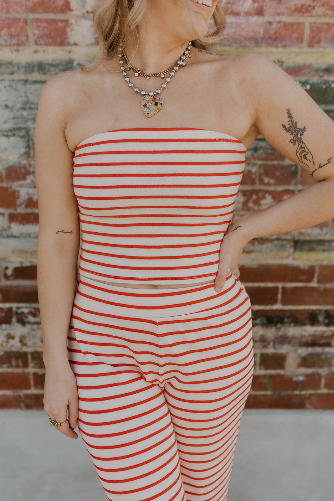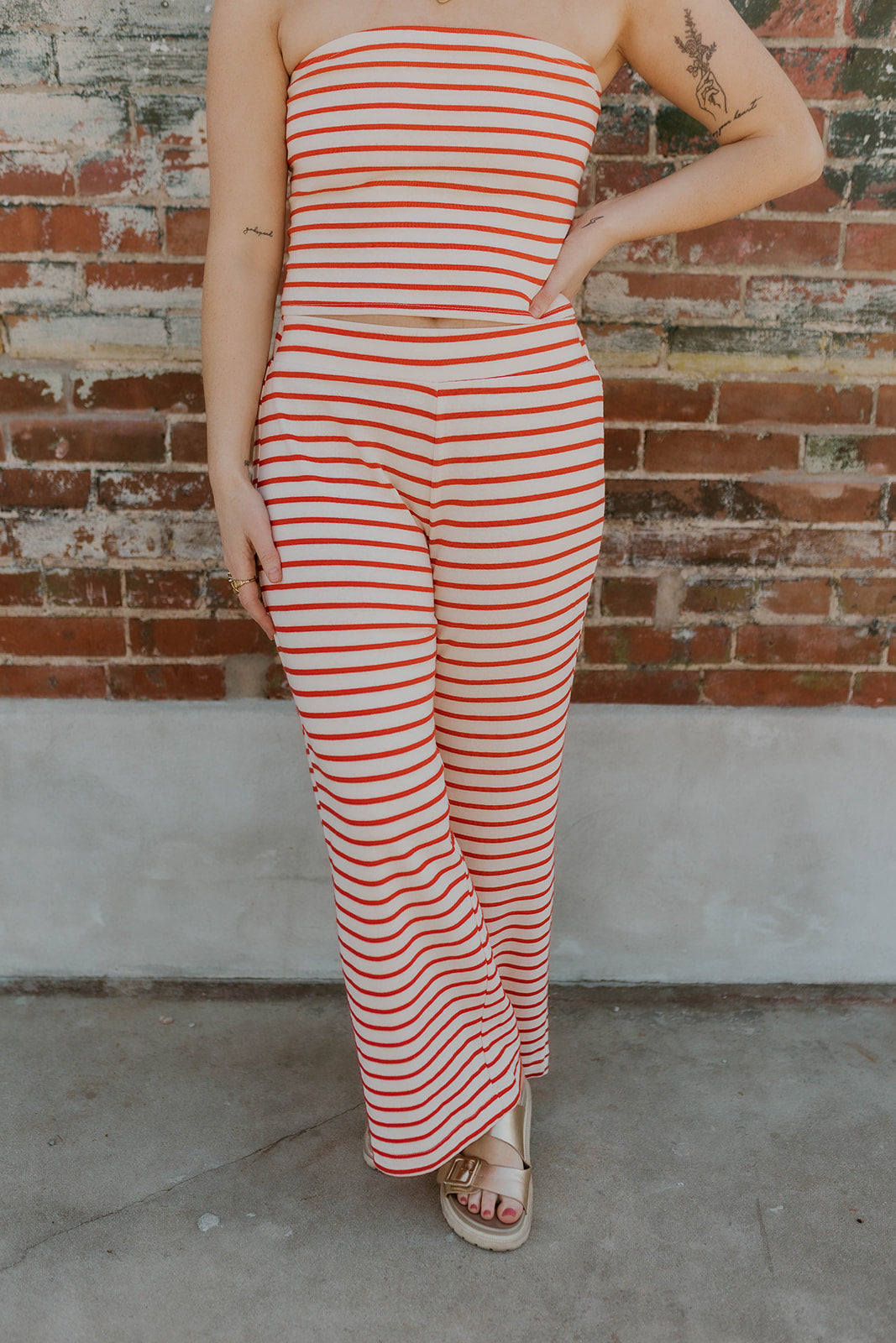 Effortless coastal style meets comfort in this striped two-piece set. The fitted tube top pairs perfectly with wide-leg pants for a relaxed, flattering silhouette. Classic red stripes bring timeless appeal to any wardrobe. True to size for an ideal fit straight out of the box. Perfect for weekend getaways, casual outings, or lounging at home.
