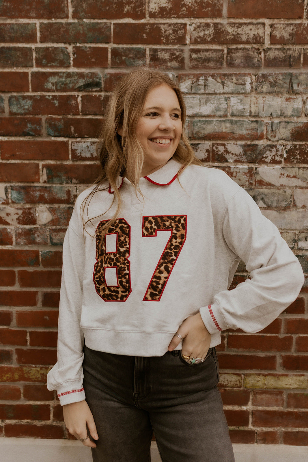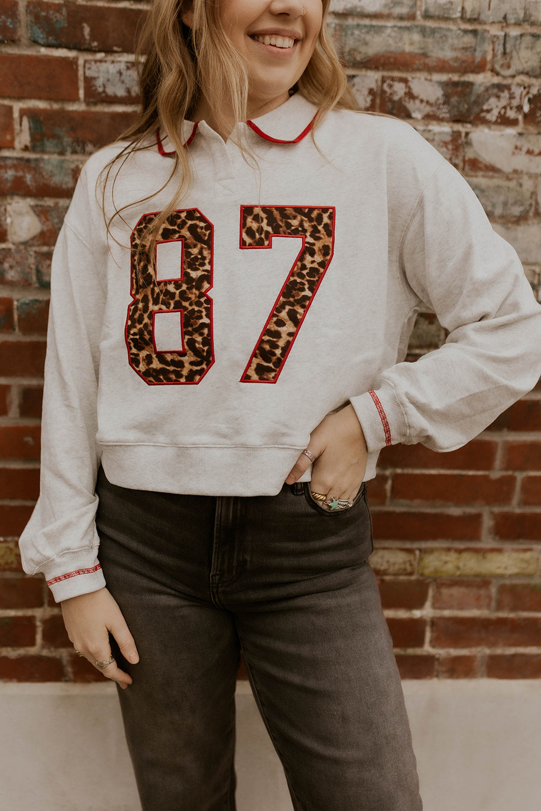 The 87 Varsity Style Pullover combines sporty charm with a trendy edge. Featuring slightly cropped length, bold leopard-print numbers, and unique patched details, this collared pullover transitions effortlessly from casual to dressed-up looks. Its versatile varsity style makes it a standout piece that adds personality and flair to your wardrobe.