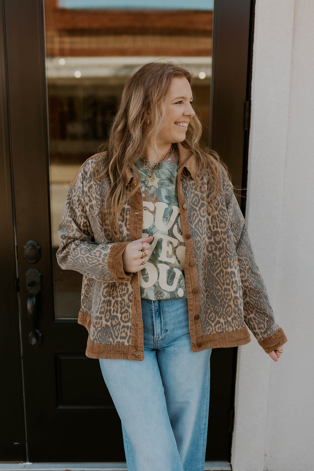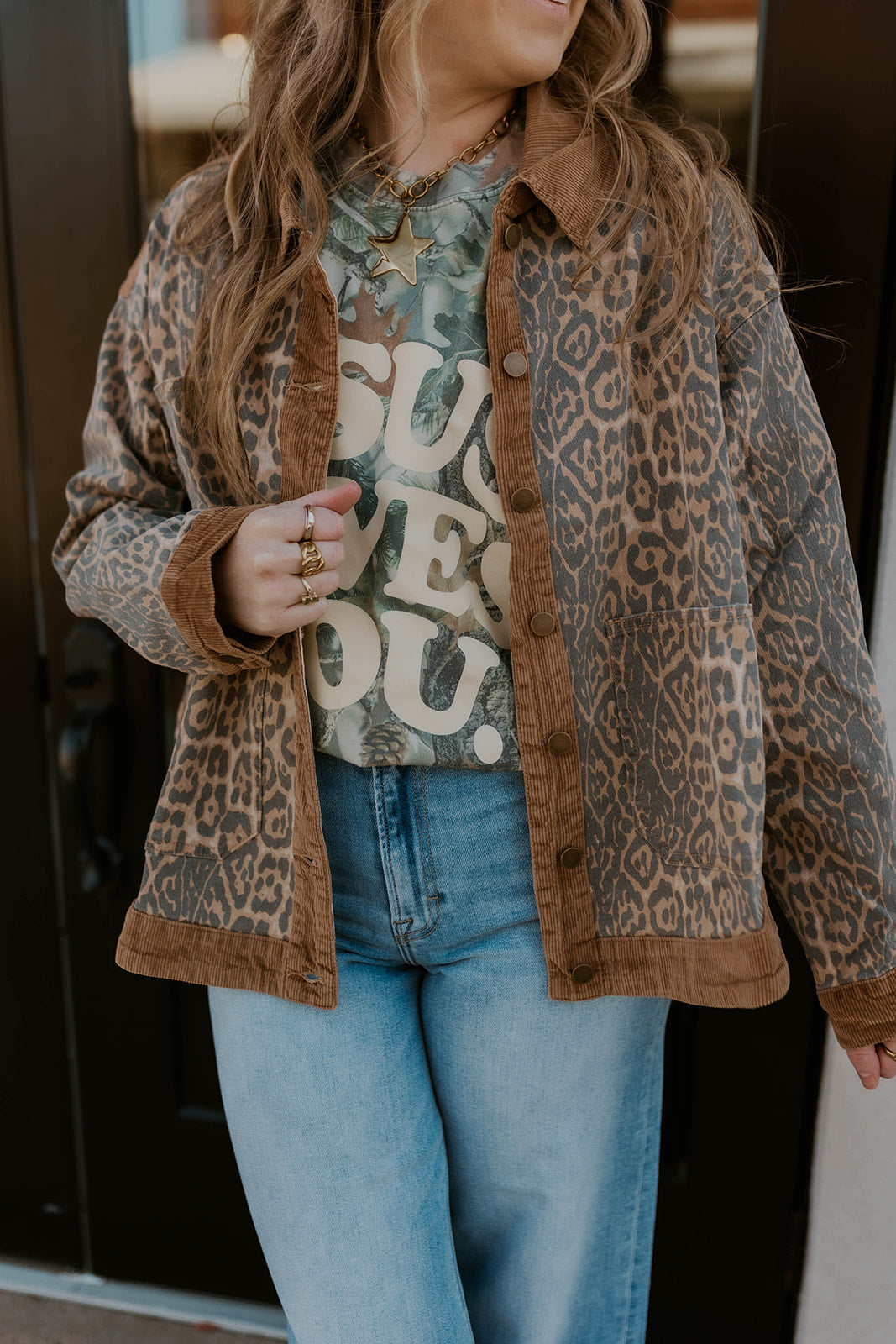 Make a statement with this oversized leopard print barn jacket that effortlessly transitions from casual to polished. The luxe corduroy trim detailing adds texture and visual interest, while the relaxed fit flatters every silhouette. Layer it over your favorite dress for an unexpected twist, or pair with denim for laid-back weekend vibes. This on-trend piece is the versatile essential your wardrobe has been waiting for.