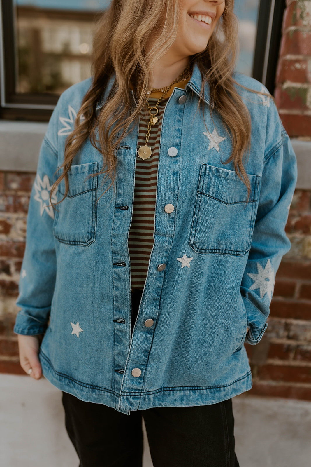 Elevate your look with this Star Embroidered Denim Jacket, an oversized and lightweight staple for any wardrobe. Its unique star embroidery adds a touch of personality, making it perfect to dress up or down. Easy to layer, this versatile piece offers both style and comfort for everyday wear.