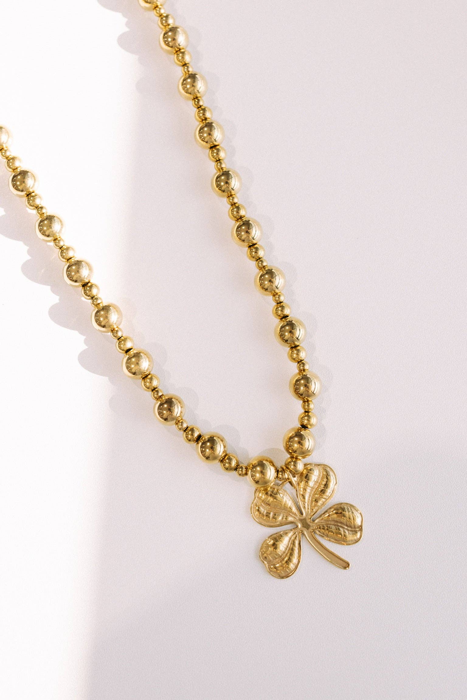 Wear your luck with the Darbi Clover Necklace. This unique necklace features a gold 4 leaf clover pendant a fun beaded bubble chain for a unique and trendy look. Layers well with others or wear it on it's own!