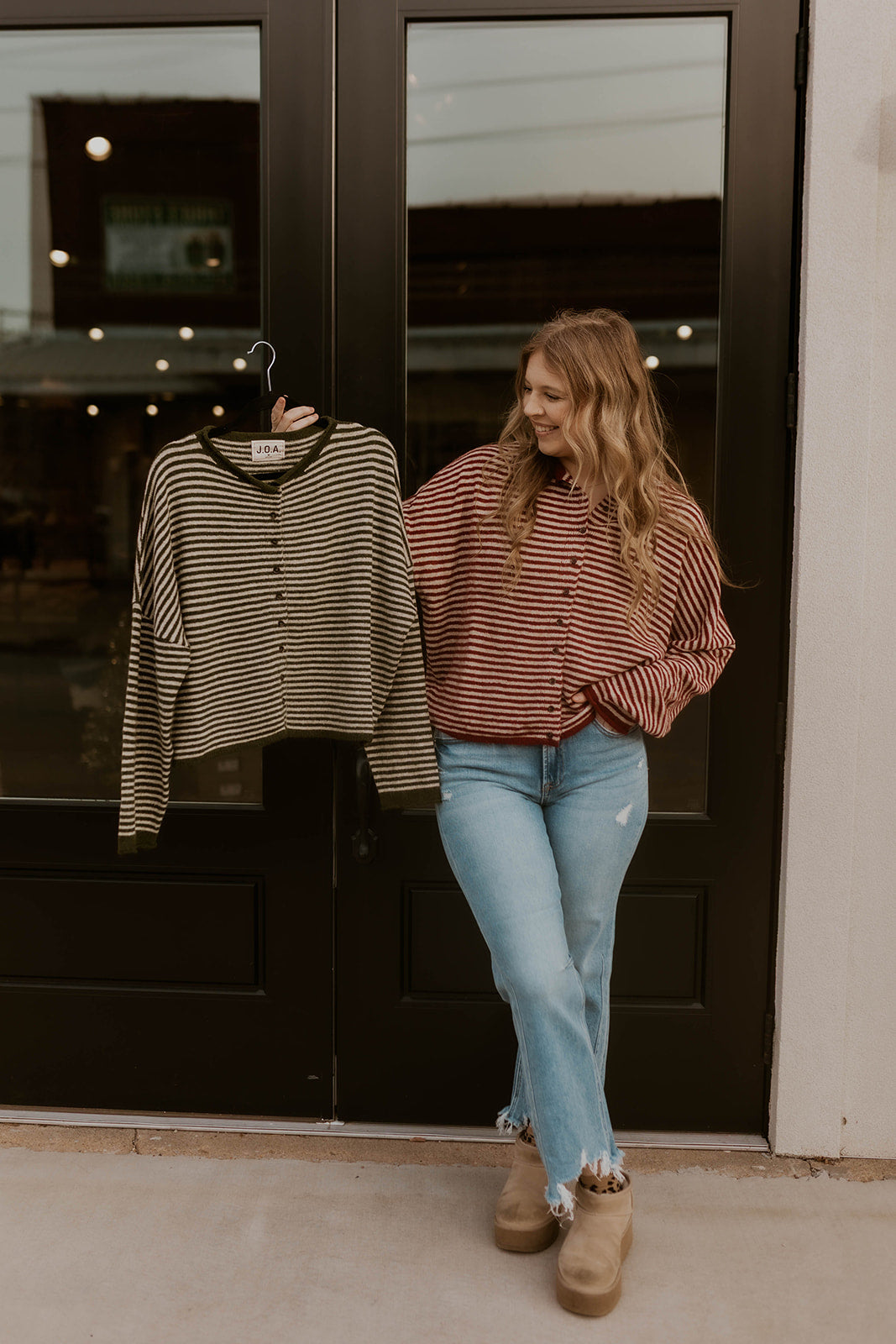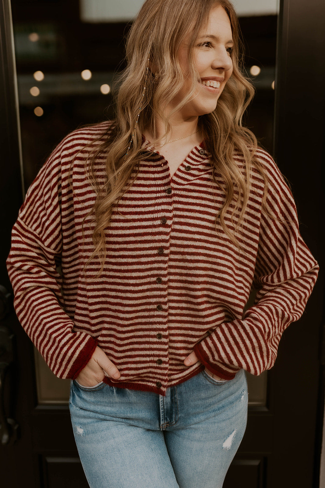 The Not The Usual Striped Cardigan in Deep Red is your new essential layer. Wrapped in irresistibly soft fabric, this piece features a generous fit that moves with you throughout your day. The classic stripe design works hard—pair it with your favorite jeans for weekend ease or throw it over a dress to instantly elevate your look. Versatile enough for any occasion, this cardigan proves that comfort and style don't have to compete. Make it your go-to for effortless sophistication.