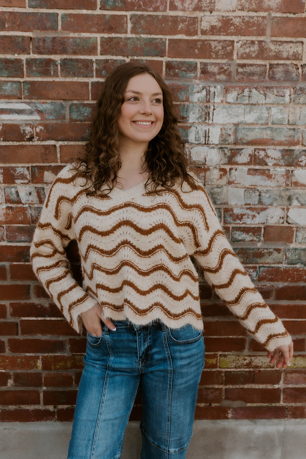 Wavy Stripes Sweater Elevate your everyday wardrobe with this versatile sweater that effortlessly transitions from casual to polished. The playful wavy stripe pattern brings a fun, modern edge while the classic V-neckline flatters any frame. Crafted for comfort, this cozy layer works just as well with jeans and sneakers as it does dressed up with tailored trousers. Perfect for those who want style without compromise—one piece, endless possibilities.