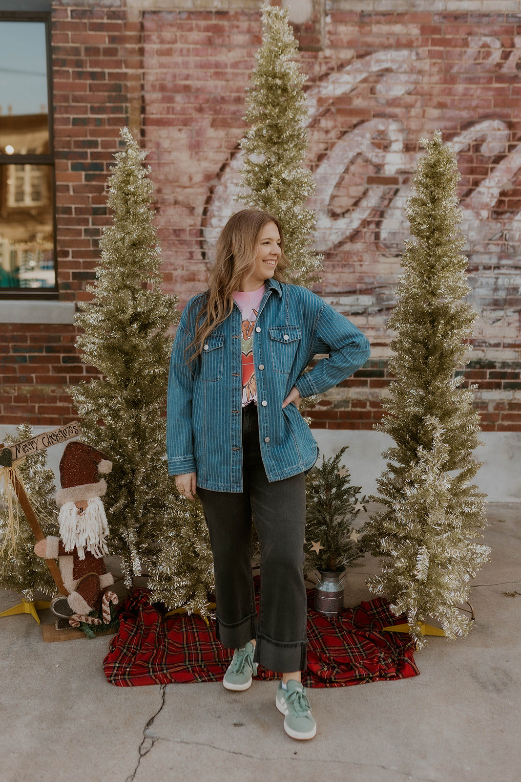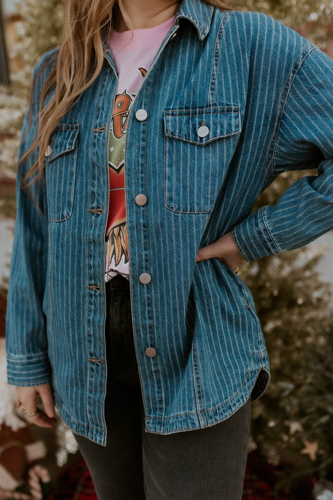 Elevate your everyday style with this oversized denim jacket that captures authentic vintage charm. Featuring subtle pinstripe detailing that adds sophisticated dimension, this piece effortlessly layers over any outfit for an instantly cool, retro-inspired look. The relaxed fit provides comfort without sacrificing style, making it a versatile wardrobe essential that works season after season. Perfect for those who appreciate timeless fashion with character and edge.