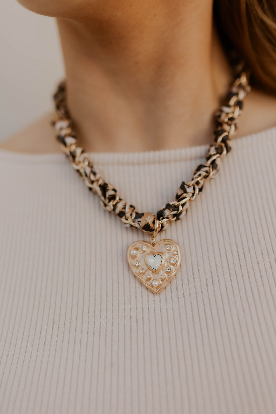 Elevate any outfit with this striking Double Cord Charm Necklace, where luxe gold chain intertwines with bold leopard fabric for an eye-catching mix of textures. The chunky heart charm adds a touch of romance and personality, making it the perfect piece to transition seamlessly from casual daytime wear to evening glamour. Layer it, wear it solo, or let it be your statement accessory—this versatile necklace adapts to your style and mood.