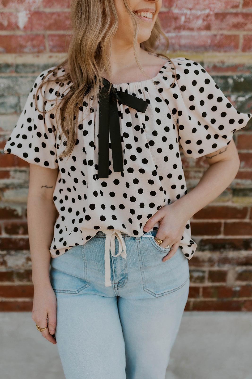 Elevate your wardrobe with this charming polka dot top featuring a delicate bow detail that adds instant sophistication. The versatile design transitions seamlessly from casual to dressy—wear it on or off the shoulder for multiple styling options. Perfect for creating effortless, polished looks whether you're heading to brunch or a night out. The playful polka dot pattern brings a timeless, feminine touch to any outfit.
