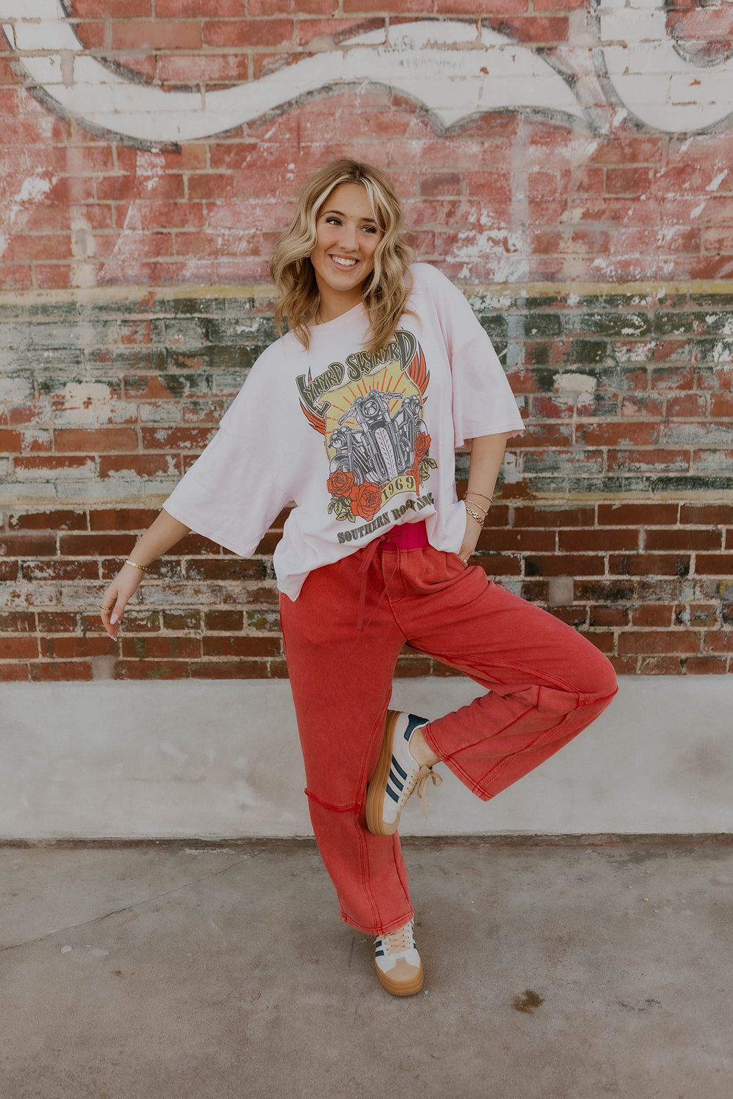 Elevate your casual wardrobe with these Contrast Band Washed Terry Pants—the perfect blend of comfort and style. Crafted from soft terry material, they feature a striking pink waist band and bold red legs that make a statement without sacrificing ease. Mineral wash detailing adds vintage charm, while playful seam accents keep things interesting. Whether you're dressing up for a night out or keeping it cozy at home, these pants adapt to your mood. Comfortable, cute, and undeniably versatile—they're the go-to piece you'll reach for again and again.