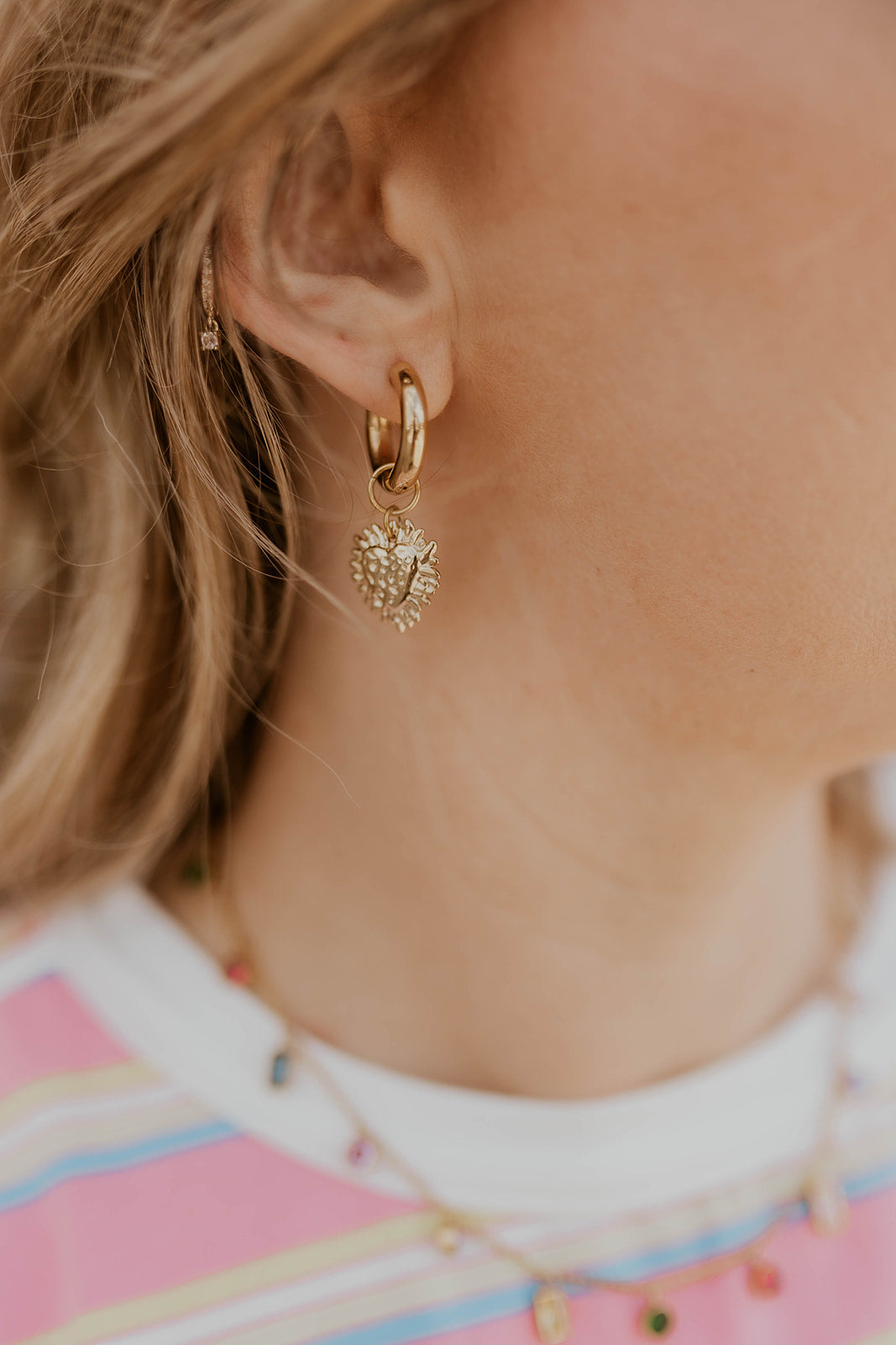Delicate gold-plated stainless steel heart hoops that bring a touch of playful elegance to any look. These lightweight earrings feature charming heart-shaped designs with a lustrous gold finish that resists tarnishing. Perfect for everyday wear or special occasions, they're hypoallergenic and durable enough to become your go-to accessory. A fun way to express your style with timeless appeal.