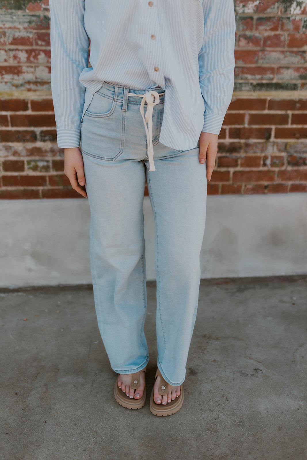 Experience effortless style and comfort with the Jodi High Rise Tie Waist Jeans in Risen. These jeans feature a flattering high-rise fit and a trendy tie waist that accentuates your silhouette. Crafted from stretchy fabric, they offer all-day comfort without compromising shape. The clean wash design adds a polished touch, making these jeans perfect for both casual and dressed-up looks. Elevate your wardrobe with a pair that combines style, comfort, and a figure-flattering fit.