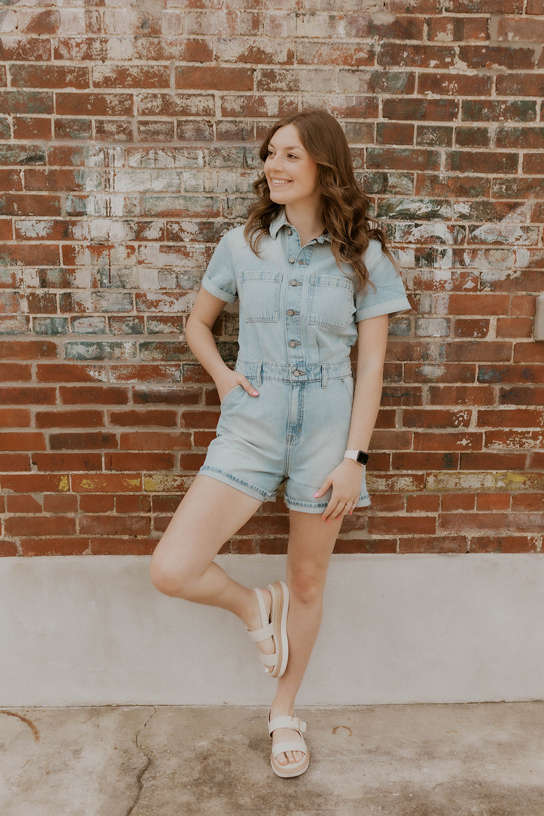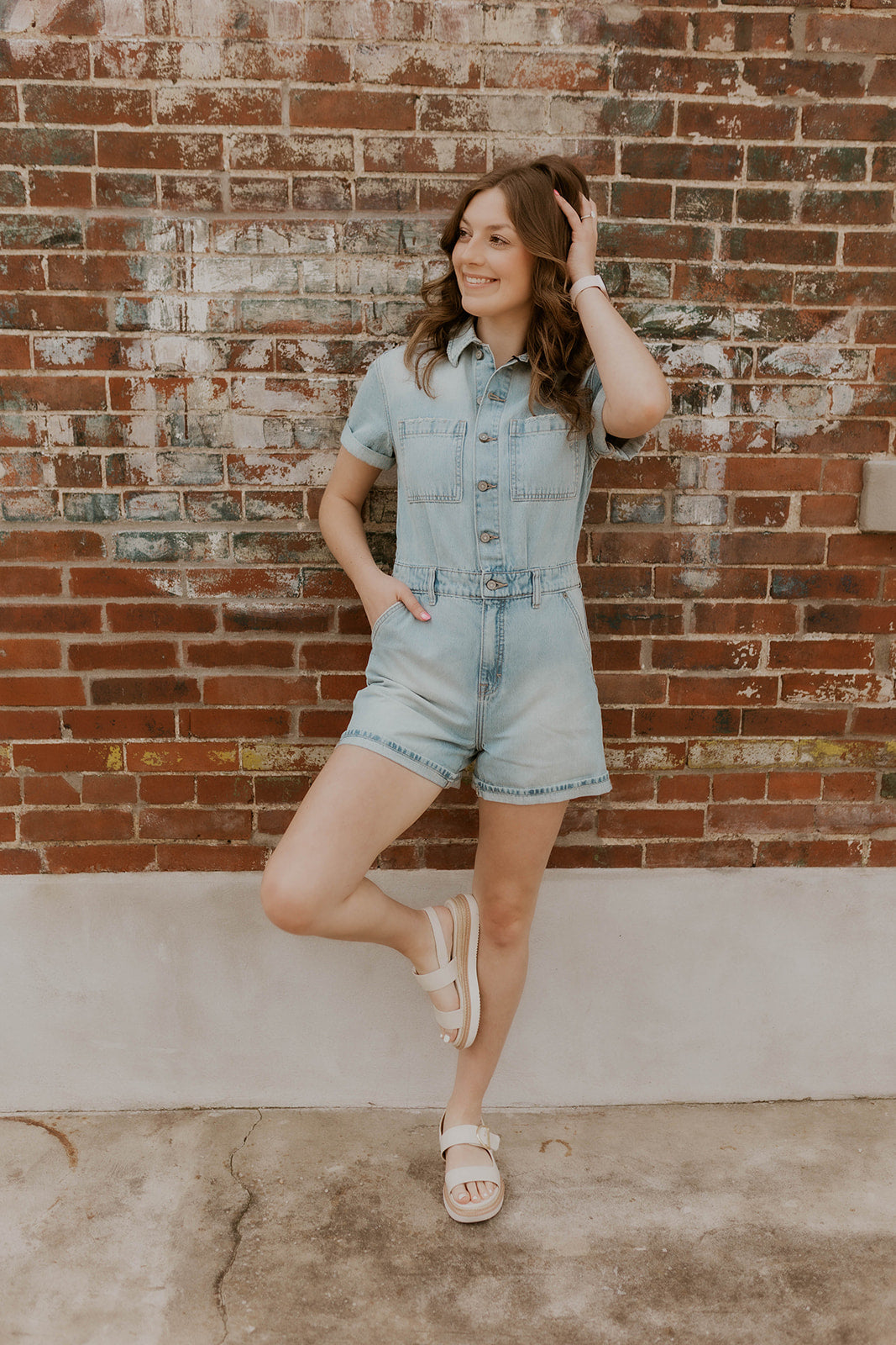 The Dylan Denim Short Romper combines utility style with versatile fashion. Crafted from rigid denim, it features fully functioning buttons and a cuffed hemline that can be worn cuffed or uncuffed to suit your mood. Perfect for dressing up or down, this romper offers both style and practicality for any occasion.