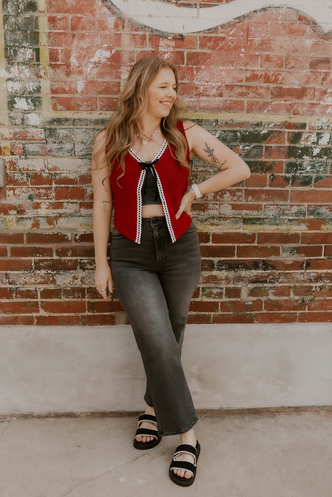 Elevate your wardrobe with this Ribbed Knit Tie Front Vest in a rich wine color. Its versatile design allows you to dress it up or down effortlessly. Wear it alone for a chic, casual look or layer it over a jumper or dress to add texture and warmth. The ribbed knit fabric and tie-front detail create a flattering silhouette that’s both stylish and comfortable. Perfect for any season, this vest is a must-have piece that brings cozy sophistication to your everyday outfits.