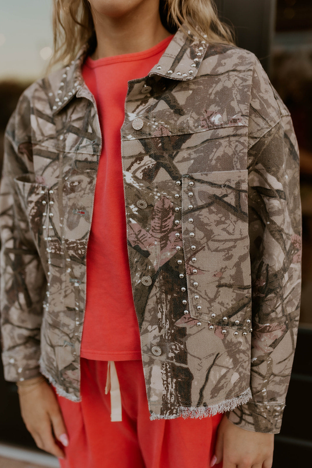 Make a bold statement with the Studded In Camo Denim Jacket—where edgy attitude meets outdoor style. Crafted from classic denim in striking real tree camo, this jacket features eye-catching stud details that elevate your everyday look. The boxy, oversized silhouette offers comfort and movement while delivering that coveted relaxed-cool vibe. Perfect for layering or wearing solo, this piece transforms any outfit into something distinctly you. Embrace your unique style with a jacket that refuses to blend in.