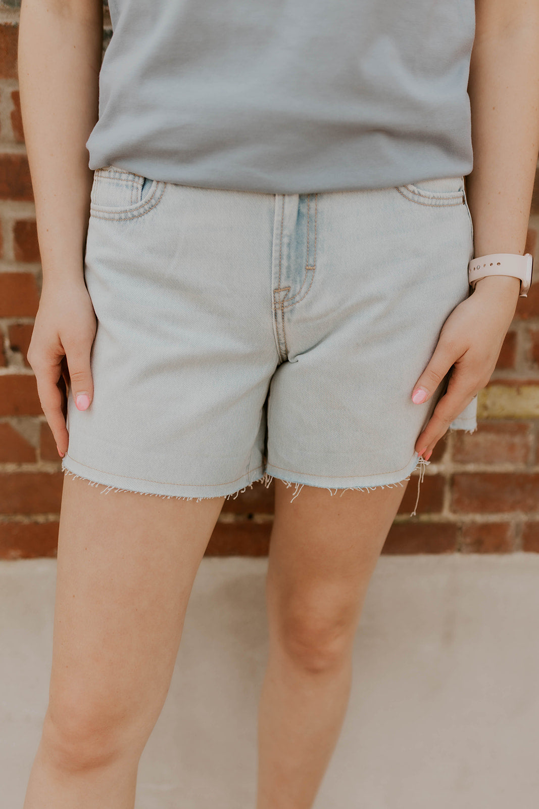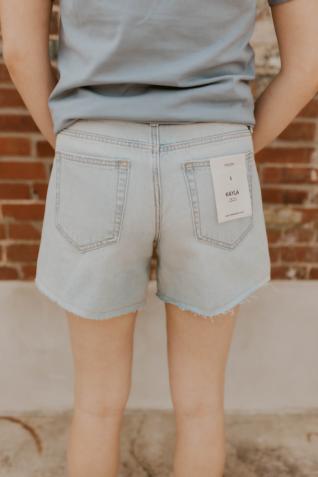 Experience effortless style with the Kayla High Rise Denim Shorts. Crafted from rigid, light-wash denim, these shorts offer a relaxed fit that flatters every shape. Whether you prefer a cuffed look or a classic hem, they adapt to your mood and outfit. Perfect for warm days, their high-rise design enhances your silhouette while providing comfortable support. Elevate your casual wardrobe with these versatile, timeless shorts.