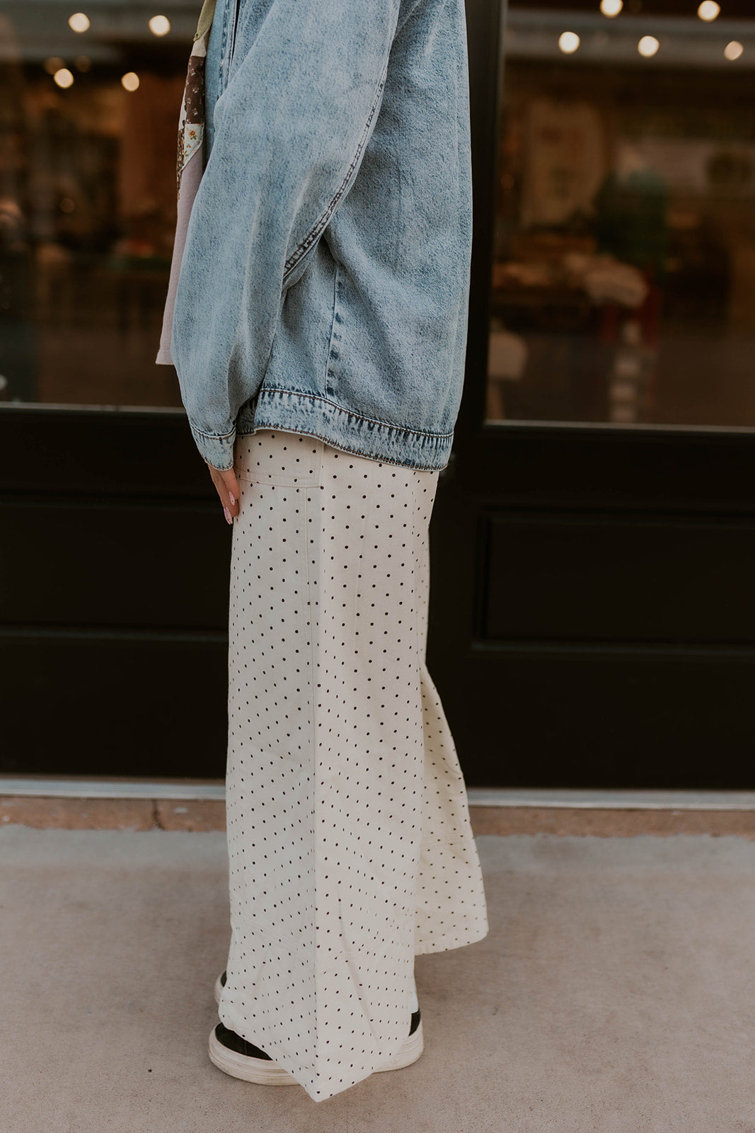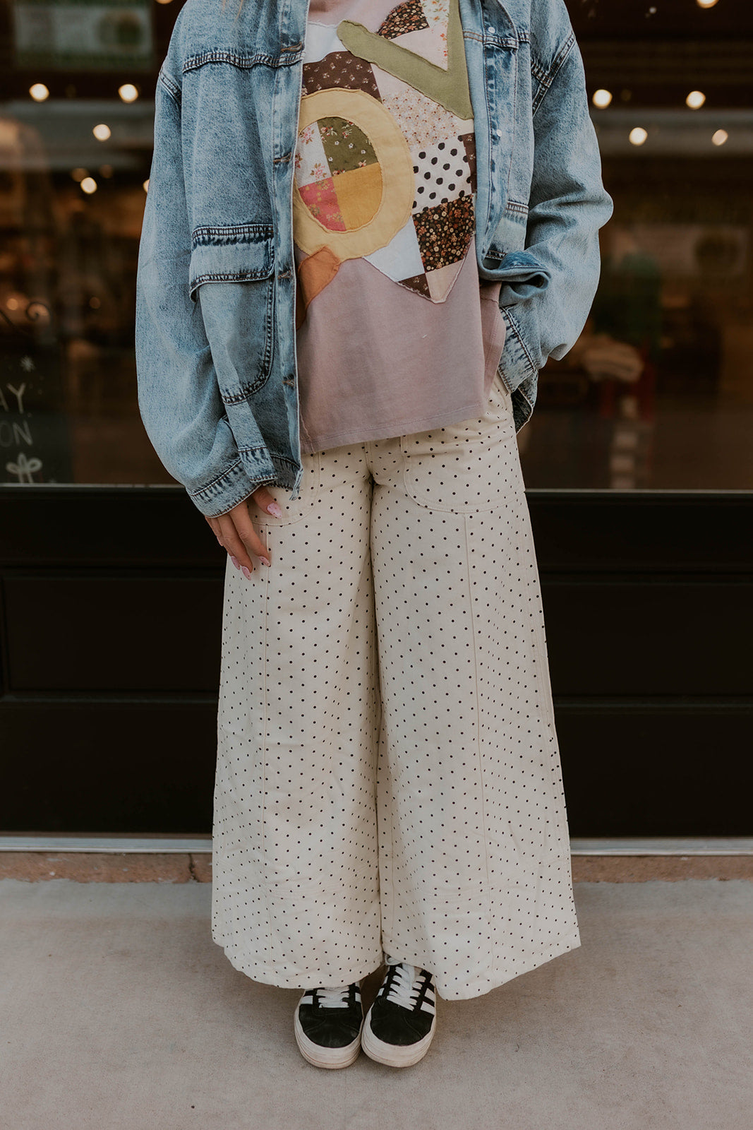 Elevate your everyday wardrobe with these Made For Me Wide Leg Pants in a charming cream dot print. Crafted from quality denim, these high-rise pants feature a comfortable elastic waistband in back paired with a structured front for a flattering silhouette. Functional carpenter-style pockets add practical flair, while the relaxed wide-leg cut works seamlessly from casual weekends to dressed-up occasions. True to size and designed for all-day comfort, these versatile pants are the effortless staple you've been searching for.