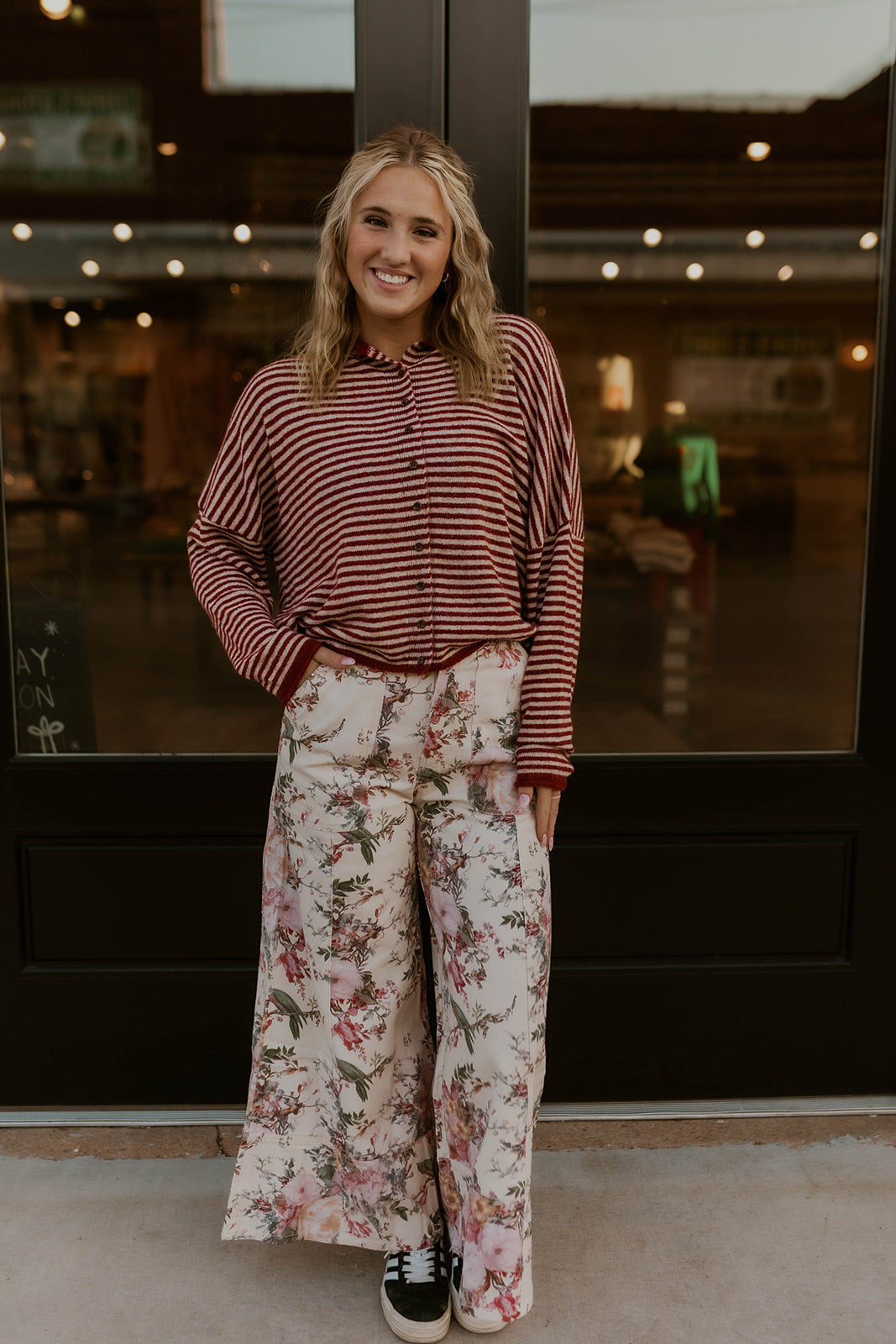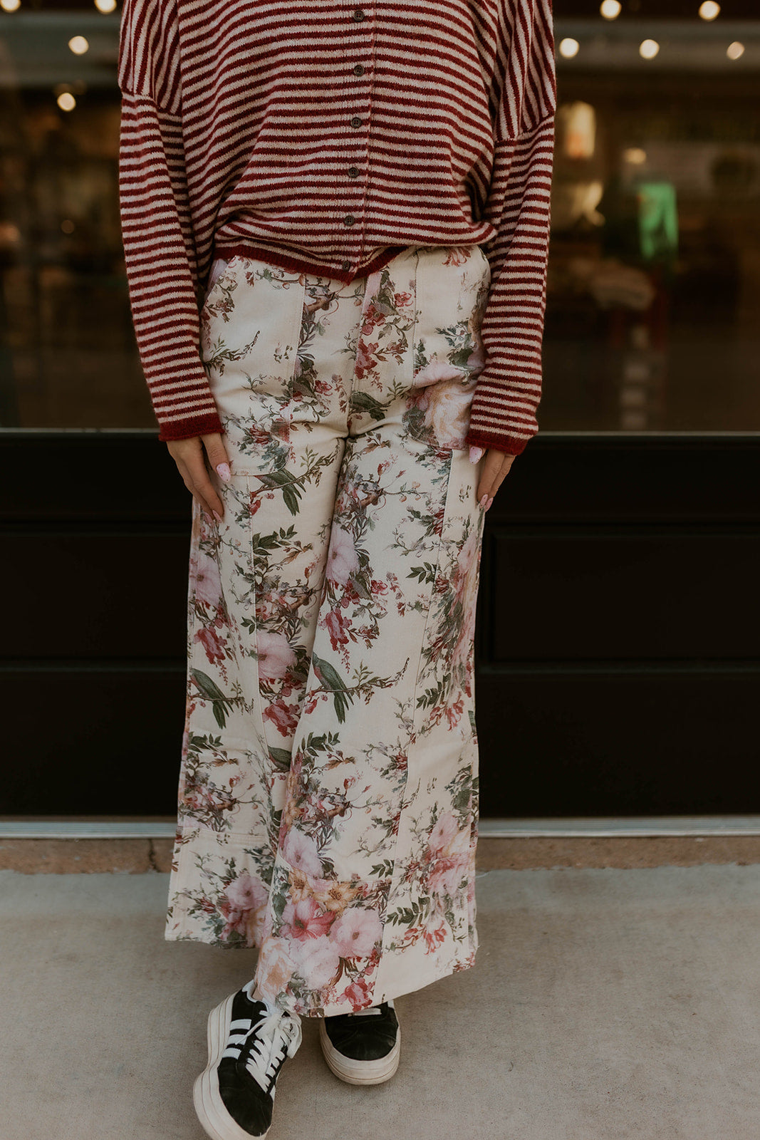 Elevate your everyday wardrobe with these Made For Me Wide Leg Pants in a charming cream floral print. Crafted from quality denim, these high-rise pants feature a comfortable elastic waistband in back paired with a structured front for a flattering silhouette. Functional carpenter-style pockets add practical flair, while the relaxed wide-leg cut works seamlessly from casual weekends to dressed-up occasions. True to size and designed for all-day comfort, these versatile pants are the effortless staple you've been searching for.